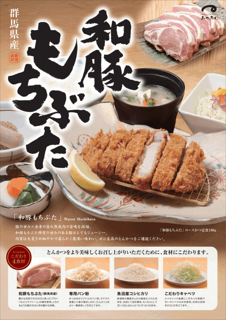 『和豚もちぶた』ロースカツ定食脂の甘み×赤身の旨み熟成肉の旨味を凝縮和豚もちぶた特有の甘みのある脂はとてもジューシー。肉質は大変きめ細やかで柔らかく奥深い味わい。当店ではとんかつをより美味しくお召し上がりいただくために、食材にこだわります。『こだわりの4食材』・和豚もちぶた‥‥豊かな自然でのびのびと育った『グローバルピッグファーム』の豚を使用 とろけるような脂の甘みときめ細やかな肉質・専用パン粉‥‥みつみねオリジナルパン粉。サクサク食感と小麦の香ばしさが 「とんかつ」をより一層美味しく引き立てます。・魚沼産こしひかり‥‥新潟県の農家さんから直接仕入れたお米を、当店にて自社精米。 もっちりとして甘いごはんは、とんかつにぴったりのお米。・こだわりキャベツ‥‥シャキシャキ食感にこだわった新鮮で甘いキャベツのみを使用。 お肉の甘味をさらに引き立てます。ぜひ、至極のとんかつをご堪能ください。